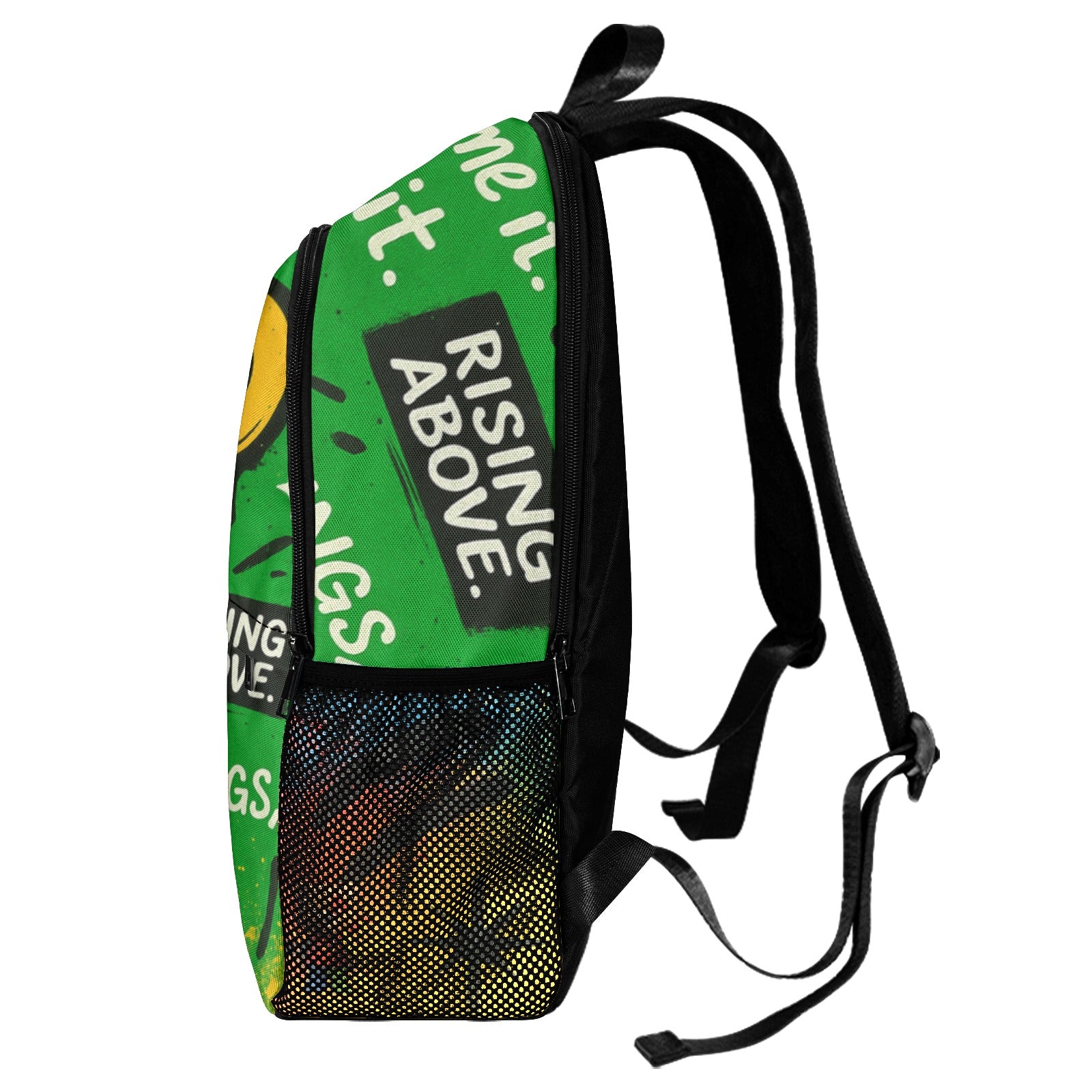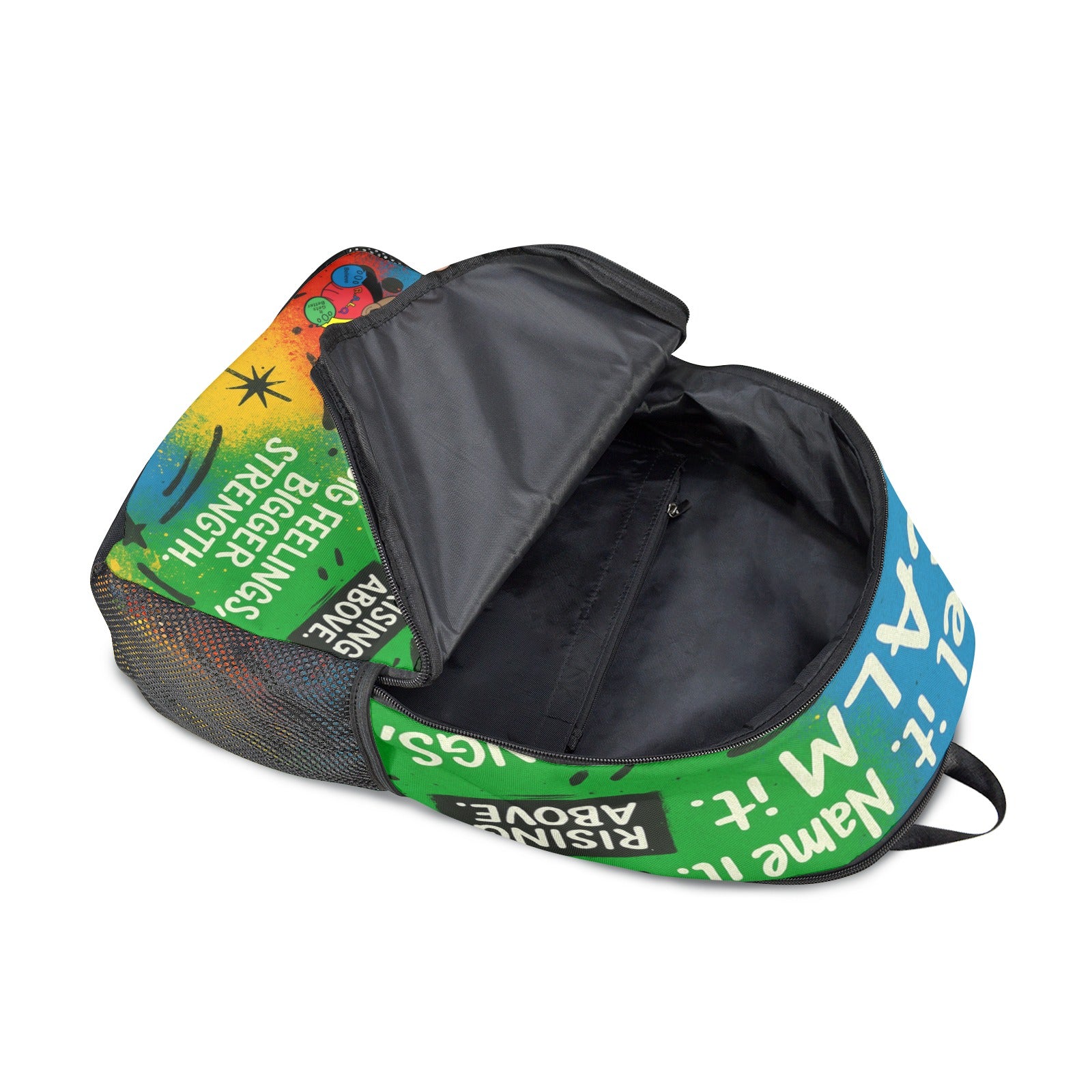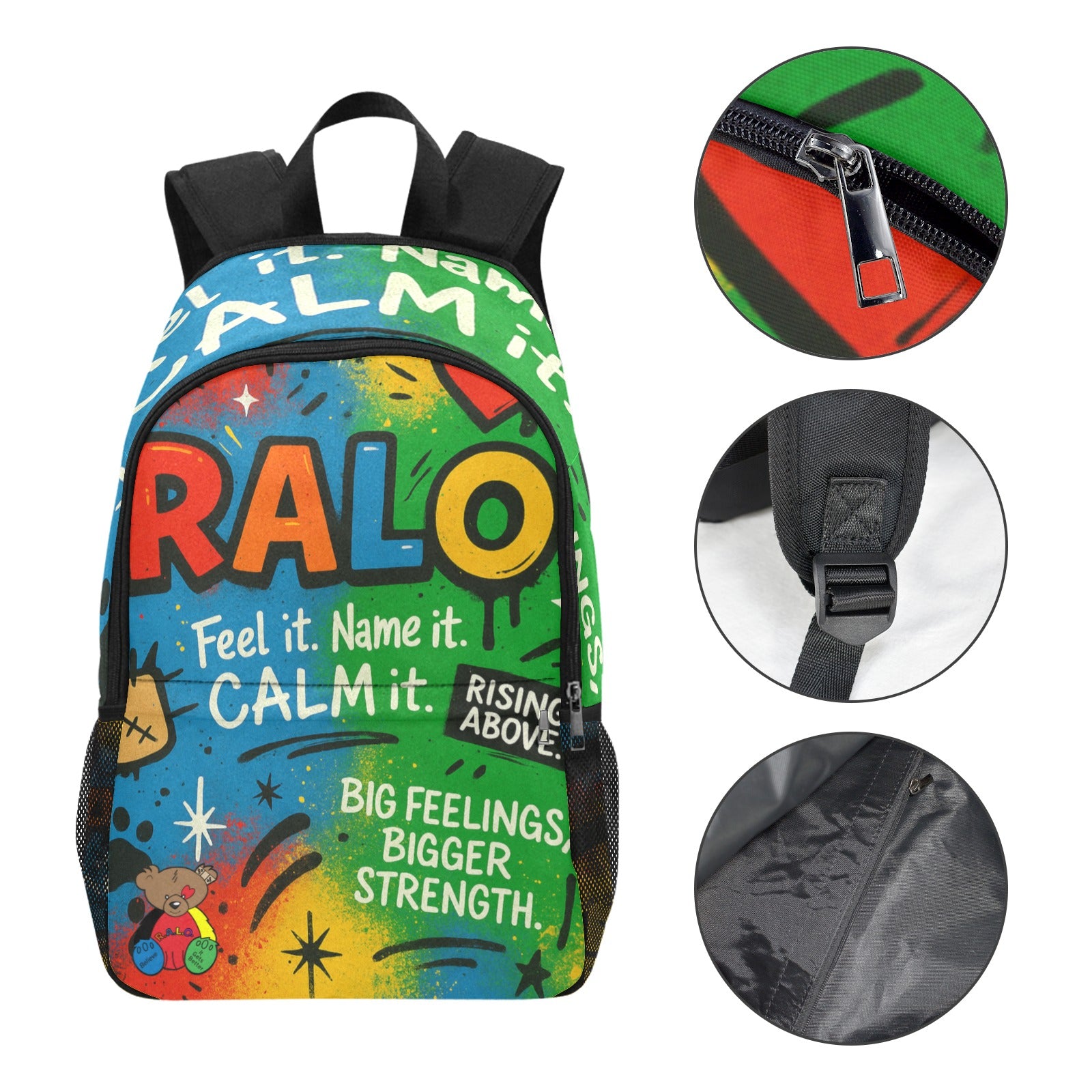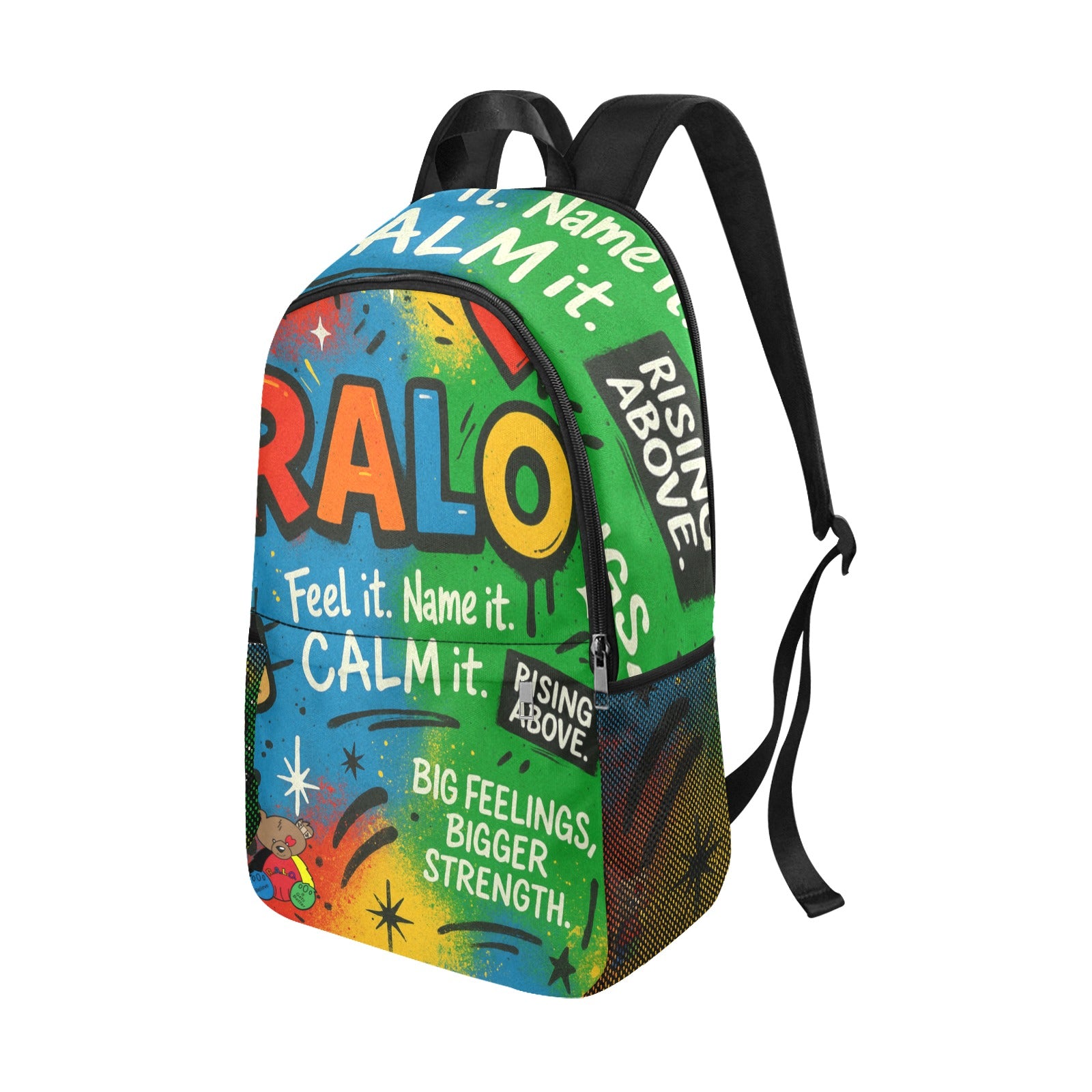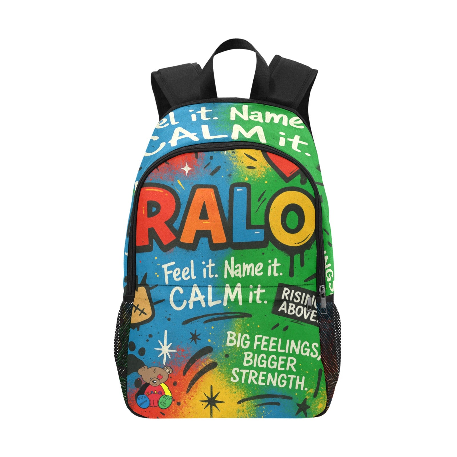"The RALO ‘Feel It. Name It. Calm It.’ Backpack is more than just a bag — it’s a movement for emotional strength and resilience. Designed with vibrant, eye-catching colors representing love ❤️, belief 💙, trust 💚, positivity 💛, and strength 🖤, this backpack encourages kids to embrace their feelings and rise above life’s obstacles. Durable, spacious, and perfect for school, travel, or everyday adventures, it features side mesh pockets and a bold RALO Bear graphic with the empowering message: Big Feelings. Bigger Strength.